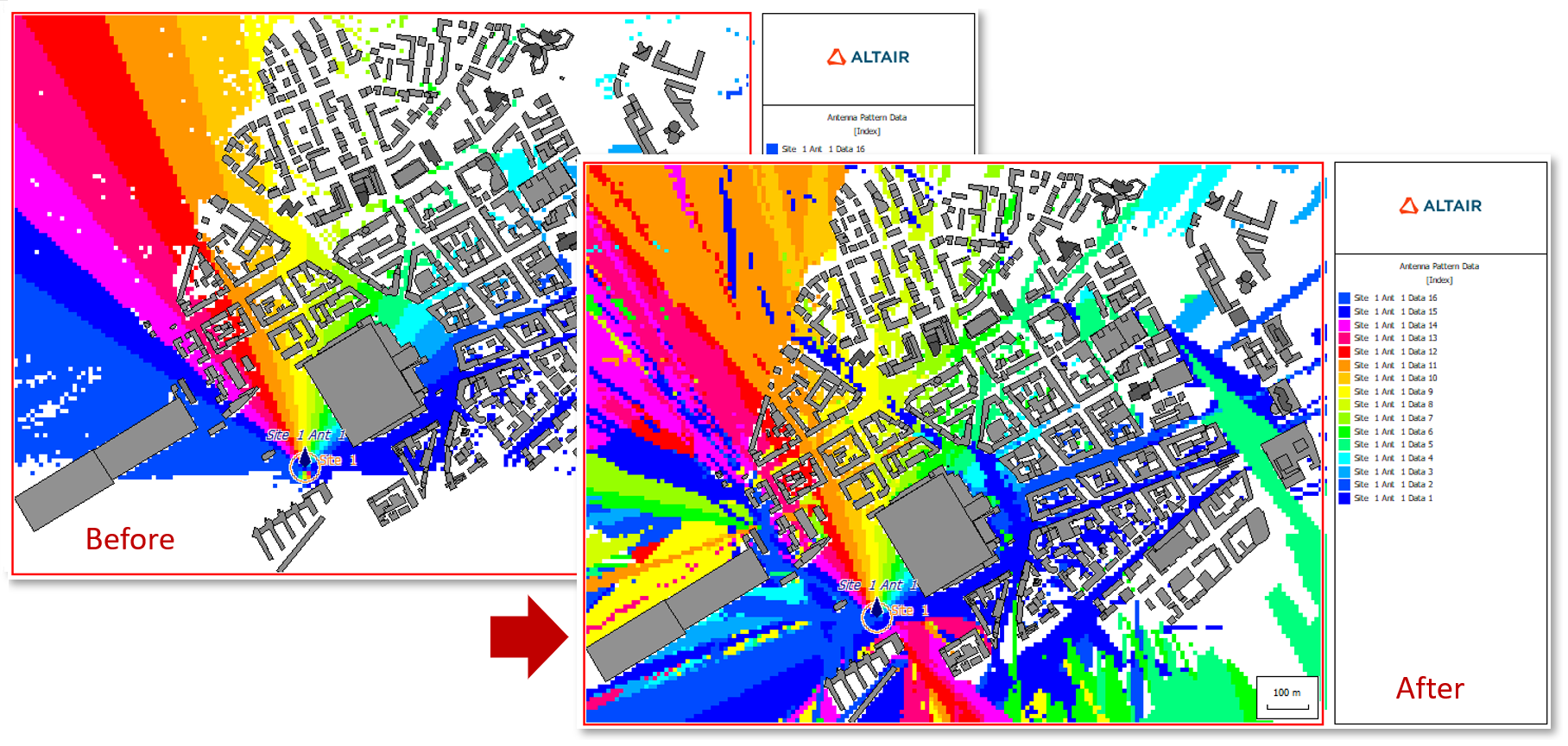 Figure 5. A before (left) and after (right) example of improved beam assignment algorithm.