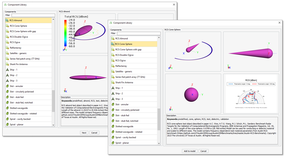 Figure 3. The RCS Almond and RCS Cone-Sphere components available in the Feko 2024 component library.