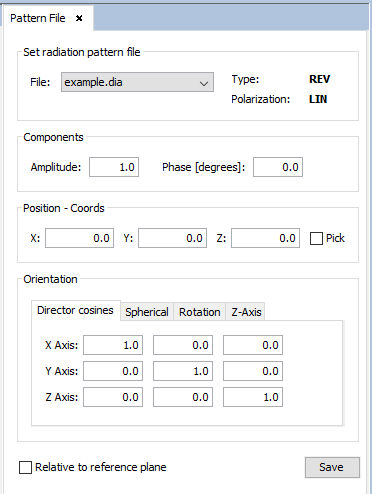 To create a radiation pattern antenna using a pattern file, select a previously imported Pattern File using the File drop-down menu (see Import Pattern File). The Type and Polarization labels will display information about the currently selected pattern file antenna. For a particular pattern file antenna, the following options are available: