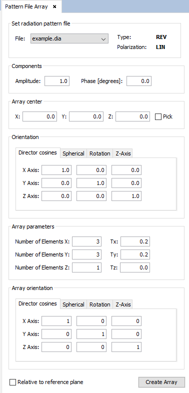 Using the "Pattern File Array" option, it is possible to create arrays of radiation pattern antennas defined based on information described in a radiation pattern file. This is useful when an array of several antennas has to be created and added to the project. When the Pattern File Array option is selected, the following panel appears.