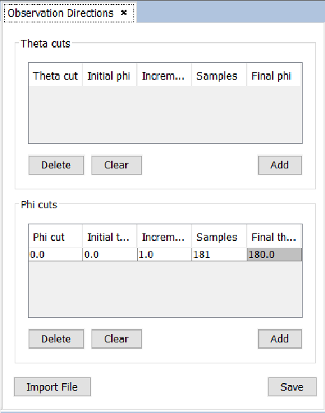 - Monostatic this check box enables the Monostatic mode, causing the values set in Incidence Angle to be ignored in order to use the range of angles specified in Observation Directions.