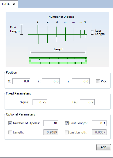 - Optional Parameters: set the number of dipoles (Number of Dipoles), the length of them (Length), the length of the first dipole (First Length) or length of the last dipole (Last Length).