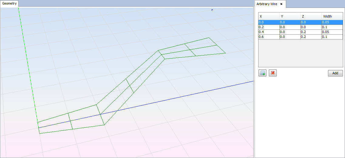 Clicking on 'Add' button, the final visualization for the antenna with a red dashed line for the coaxial feed will be shown.