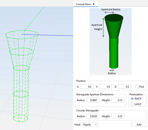- Waveguide Aperture Dimensions: defines the parameters for the conical geometry on the top of the antenna. The height defines the length of the aperture section, while the radius defines the radius of the circular hole at the end of the aperture section.