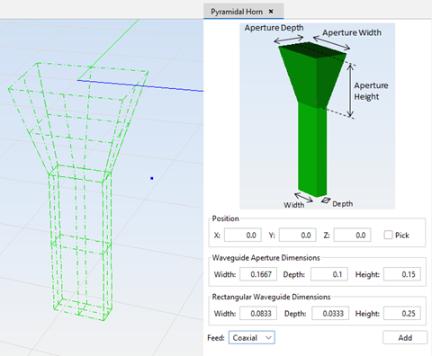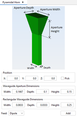 - Rectangular Waveguide Dimensions: set the values for the rectangular geometry on the bottom of the antenna. 'Width' and 'Depth' values will be added to the bottom sides of the pyramidal geometry on the top of the geometry.