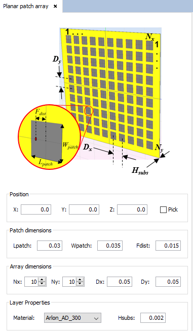 - Array dimensions: set the values of the number of patches in X (Nx), the number of patches in Y (Ny), the distance between patches in X (Dx) and the distance between patches in Y (Dy).