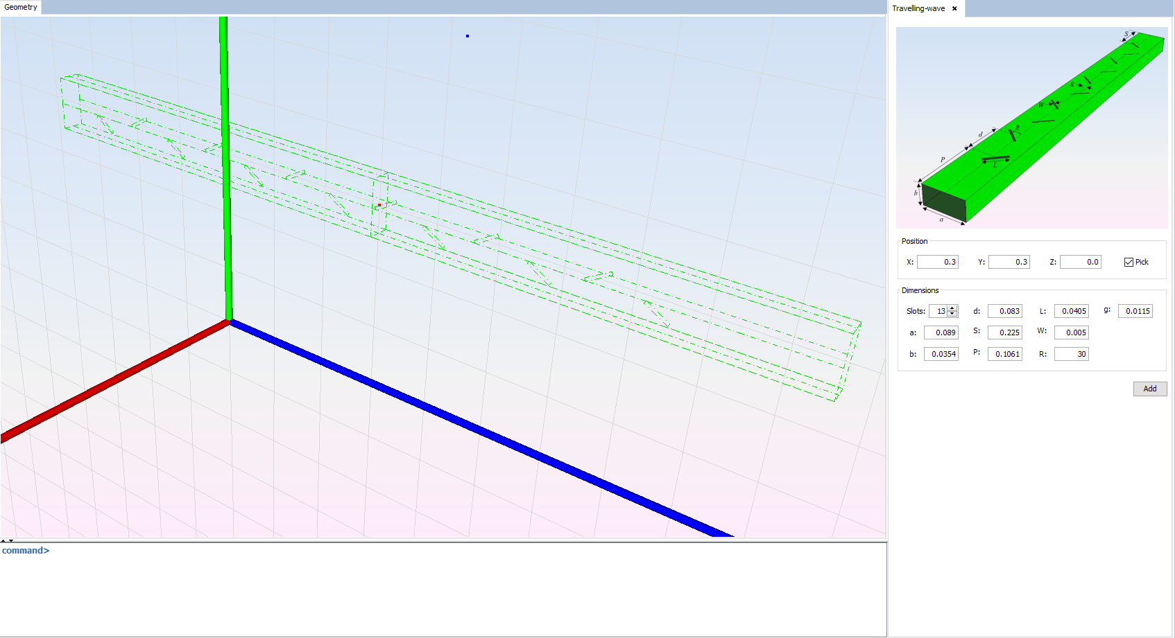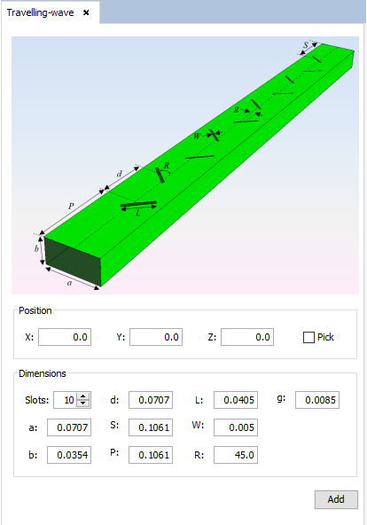 - Dimensions: set the values of the number of slots (Slots), the width and height of the feeding waveguide (a and b), the distance between adjacent slots (d), the length and width of the slots (L and W), the rotation angle of the slots (R in degrees), the distance from the start of the waveguide to the first slot center (P), the distance from the end of the waveguide to the last slot center (S) and the separation from the slot center to the broadwall center of the waveguide (g).