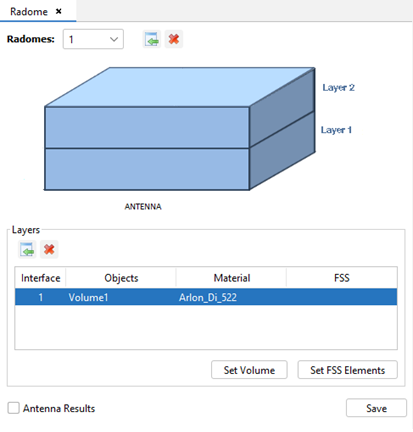 interfaces and the material defined on the inner interface. Click on to add a new radome.Figure 1. Volumetric Radome Definition Tab