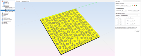 The database contains all the geometric cells available for the reflect array generation, together with their field values by frequencies and components. It must have been created by using the Periodical Structures module (see Annex 1: Creating a Reflectarray Database for an example).