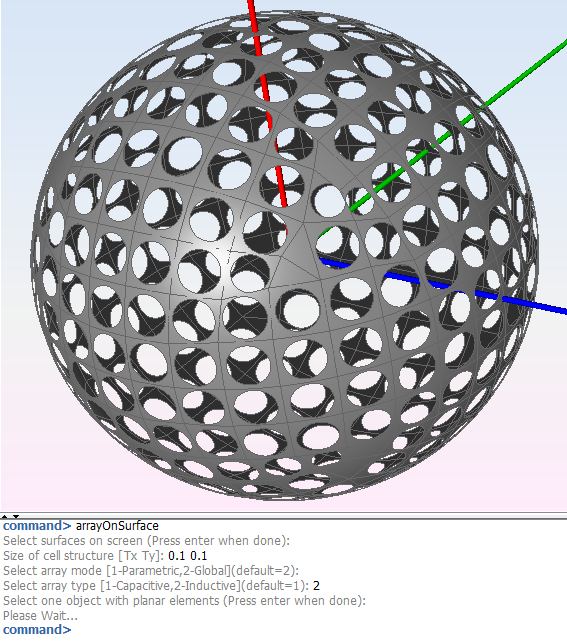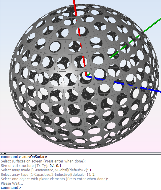 The next figure shows the full example of the disk array on the sphere generated with parametric mode (the original objects have not been deleted).