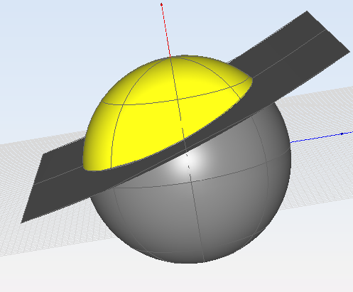 This will create cutting loops on both the sphere and the surface. The surface will be split into two surfaces the part that is outside of the sphere, and the part that is inside of the sphere. However, the sphere will not be split because it is considered a 3D object. Nevertheless, it is possible to explode the sphere (so it is divided into individual surfaces) and, because the cutting loop was created, we can select the surfaces of both parts of the sphere (above and below the cutting loop) independently, as shown in the next figure: