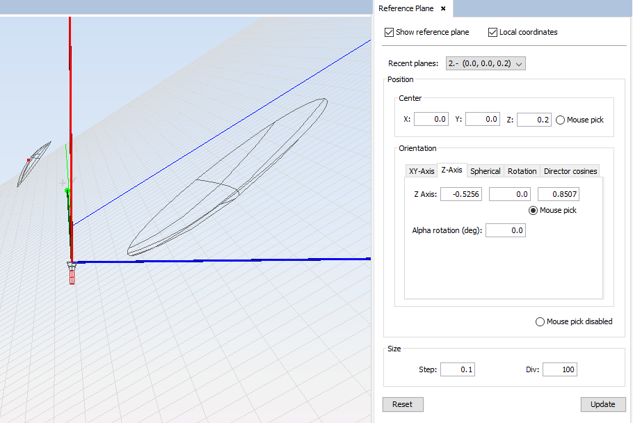 Now, we will use the localTransform command in order to locate the pyramidal horn at the feed point of the Gregorian reflector system. However, prior to this operation we will need to set the reference plane so the origin point is at the feed point of the Gregorian system, and the positive Z axis is pointing to the center of the subreflector.