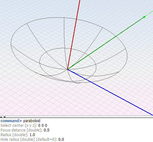 - paraboloid -n <name> -p <centerX> <centerY> <centerZ> <focus> <radius> <holeRadius>