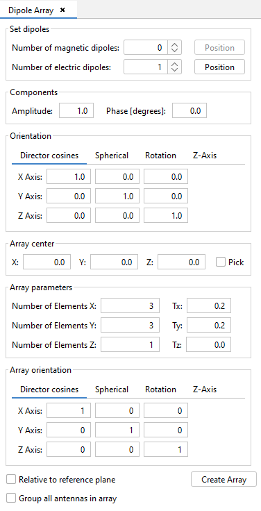 - The "Array parameters" panel contains the values that will determine the number of antennas created along each axis ( Number of Elements X, Number of Elements Y and Number of Elements Z), as well as the separations between each adjacent antenna along each axis ( Tx, Ty and Tz).