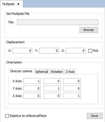 In this panel, the user can select a multipole antenna file (.suj) from the local file system. This file contains the specification for a multipole antenna arrangement. The user can also specify a transformation to apply to the loaded multipole. The transformation consists on a displacement (given by a three coordinate vector) and a rotation (given by the X, Y and Z axes of the local coordinate system of the rotation). If the Relative to reference plane check box is selected, the entered displacement and rotation will be relative to the reference plane coordinate system. Pressing the Save button will add the multipole antenna.