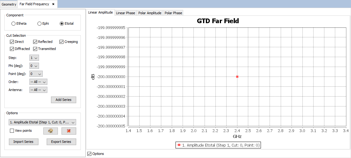 When initially open, the panel will display a default series in the plot that will represent the measurements for a particular component, step, and observation point, against every possible frequency and antenna that has been simulated. More series can be added, by selecting a component, step and spherical coordinates in the control panel that appears on the left side of the plot.