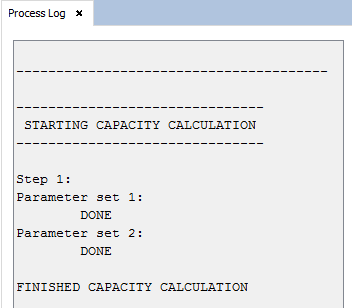 When the user presses the "Calculate" button, the application will run a post-process to calculate the capacity of the MIMO system for each of the parameter sets configured in the table. The Process Log panel will appear showing the progress of the calculation.