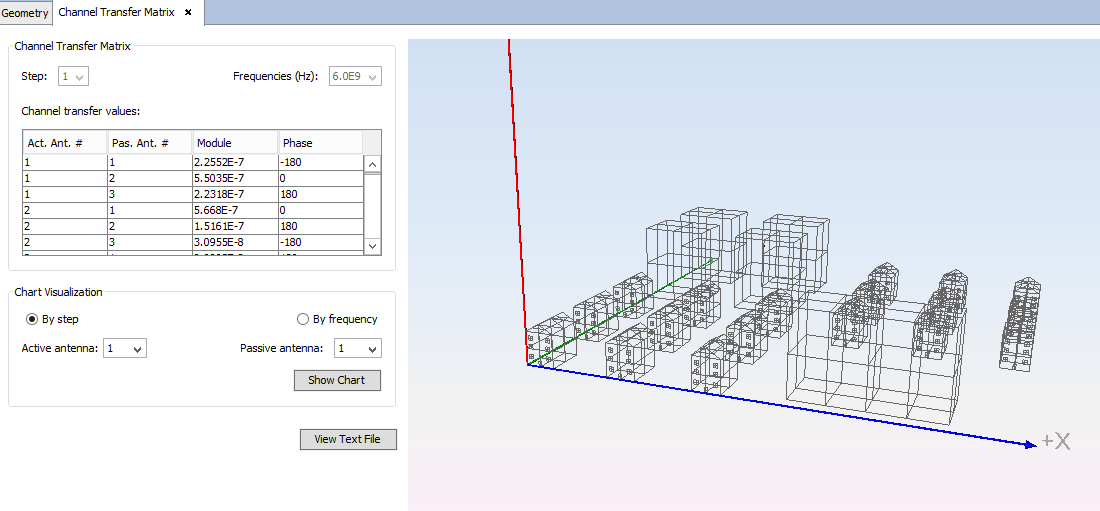 In this panel, it is also possible to visualize a plot of a certain element of the channel transfer matrix by step or frequency. Pressing the "Show Chart" button will open the Plot Viewer and visualize the selected chart. Refer to the GUI for more details on the Plot Viewer panel.