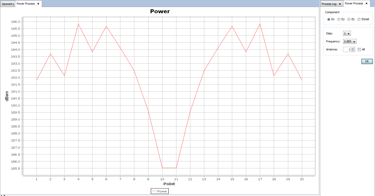 In this panel, the user can configure the component to be shown, the step, the frequency and the antenna to show the results for. Pressing the OK button will show the chart.