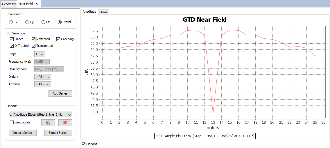 This command plots the amplitude and phase of the near field computed for each observation point of the simulation geometry. Several observation points (such us lines, planes and so on) and frequencies can be plotted in the same graphic. To plot a graph, the user can select the field component, the step, the frequency, the observation, the order and the antenna. A new graph will be plotted with the button ' Add Series'. In the case that the user has set up a parametrized geometry, it is possible to select the step to visualize the results for.
