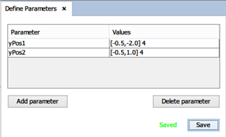 Step 2: Since we want a dynamic simulation, we need to define some parameters in order to be able to parametrize our geometry. In this simulation, we will create two boxes moving in opposite directions along the Y axis. These boxes will move at a rate of 0.5 meters per step, considering a total of 4 steps. To add a parameter, select the Geometry → Parameters → Define Parameters option and press the Add parameter. A new row in the parameters table will be created. Change the name of the parameter to something more descriptive like “yPos1” and change the text in the Values column to: