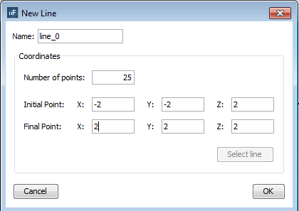 Step 6: Now we are going to add a line of observation points. Select the Output → Observation Points option. In the Geometry Types combo box, select Line and press the Add button. The following dialog will pop up. Set the line parameters as shown in the figure.