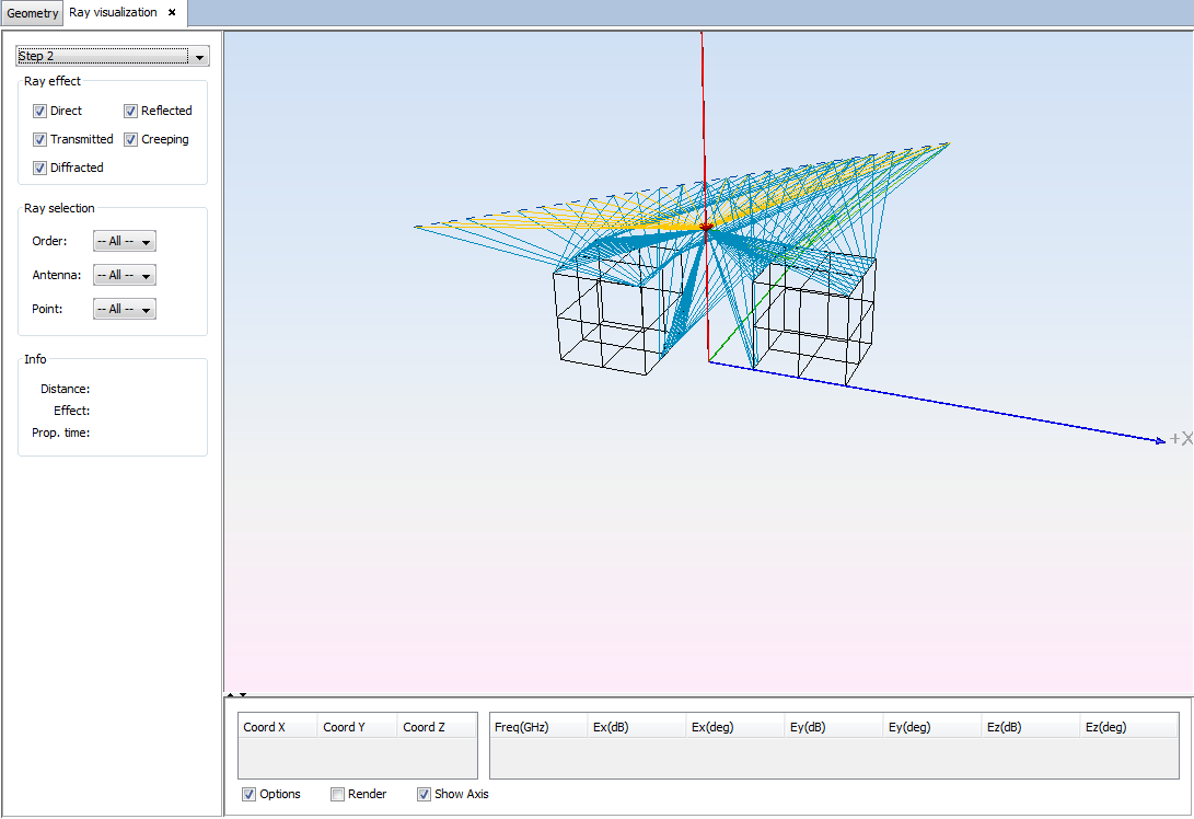 Step 9: When the calculation has finished, press Show Results → View Ray. In the left side of the Ray Visualization panel, select Step 2. The result should be the same as in the following figure: