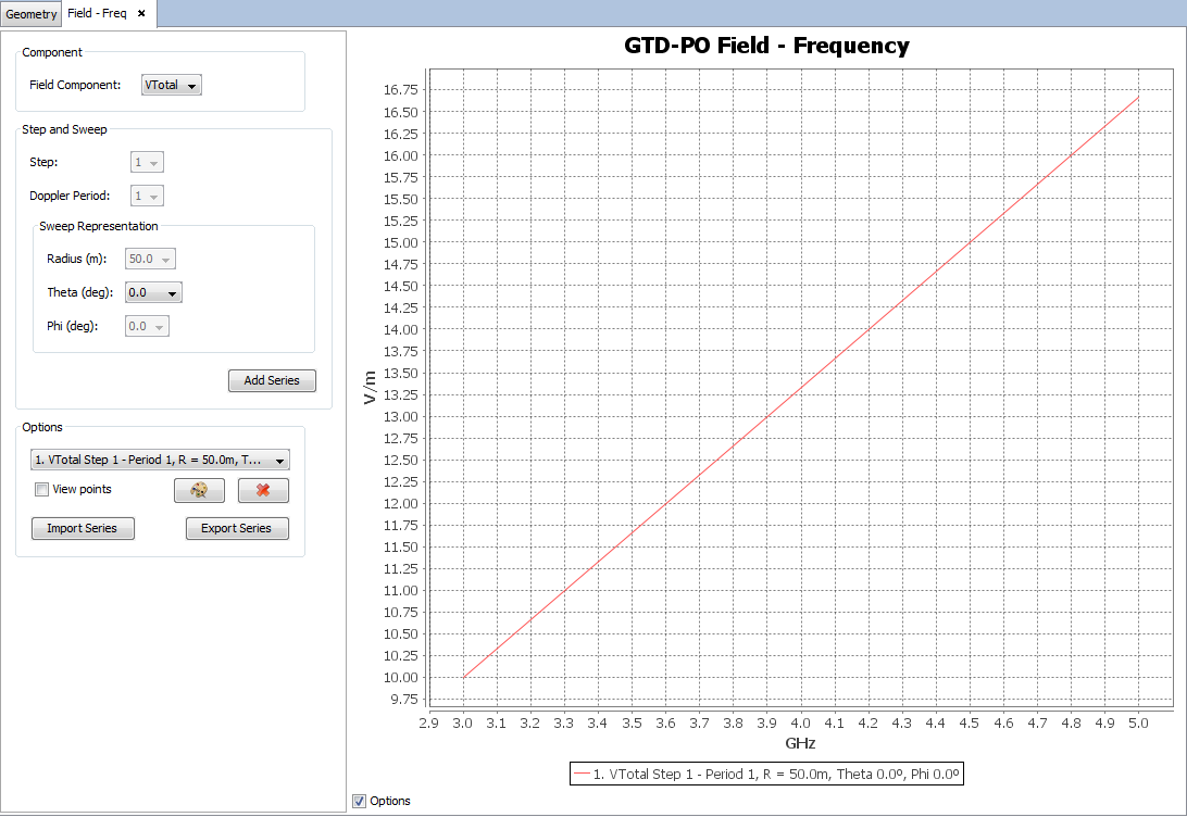When initially open, the panel will display a default series in the plot that will represent the measurements for a particular component, step, and observation direction, against every possible frequency that has been simulated. More series can be added, by selecting the component, step and sweep representation information in the control panel that appears left side to the plot.