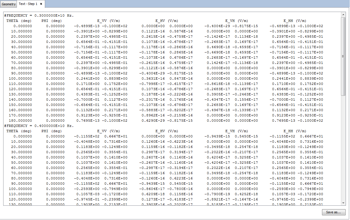 This option shows the simulation results as a text file. First, a panel should appear after selecting this option. Selecting this option will display a panel where the user should select a step, an order, a radius and a frequency. To use this section, select a parametric step from the list and one of the orders shown in the list to get the results from and click on OK to load the data. A table will be presented with the values for the electrical field. To save the result click on the Export button below the table.