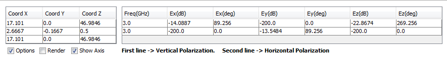After selecting a ray it will be highlighted in yellow color and its information will be shown in the panel at the bottom. The table on the left shows the coordinates of the points (source point, first reflection/diffraction point, second reflection/diffraction point... and the observation point). The table on the right shows the amplitude and phase for each of the field components. The values of the first line correspond to the vertical source polarization and the values of the second line correspond to the horizontal source polarization. However, if the source has been defined with a radiation pattern, this table will only have one line.