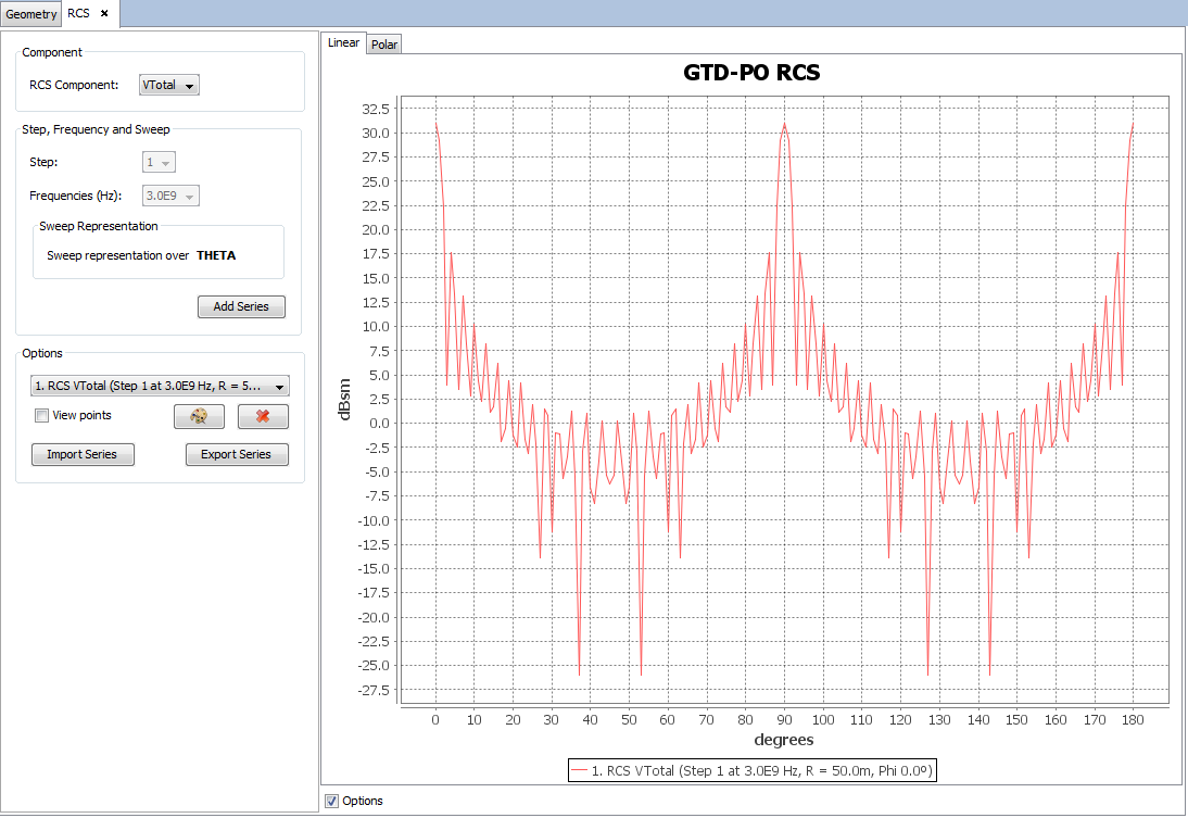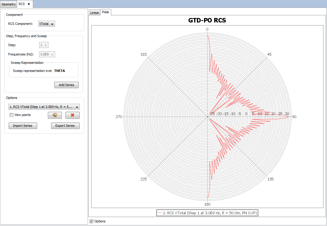 This command plots the amplitude of the RCS fields computed for each angular cut of the simulation geometry. Several frequencies can be plotted in the same graphic. To plot a graph, the user can select the RCS component and the frequency. A new graph will be plotted with the button ' Add Series'. In the case that the user has set up a parametrized geometry, it is possible to select the step to visualize the results for.