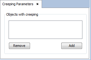 In this panel, we can add a creeping effect to objects in the geometry. To do this, select an object from the geometry view and press the Add button. The selected object will be added to the list of objects with creeping. It is possible to remove the creeping effect from an object by selecting it from the list and pressing the Remove button.