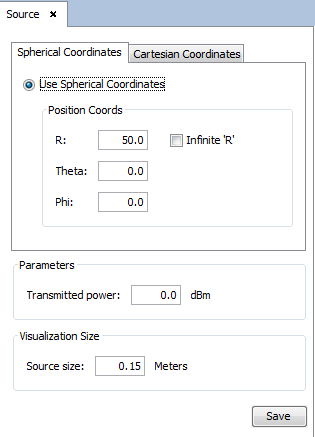 - when Use Spherical Coordinates radio button has been selected, the spherical coordinates (R, theta and phi) must be specified to define the source position.