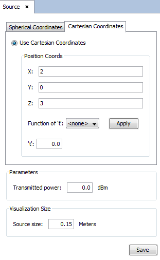 - when Use Cartesian Coordinates radio button has been selected, the Cartesian coordinates (x, y, z) must be specified to define the source position. In this case, it is possible to define the coordinates values with a function and the parameter t.