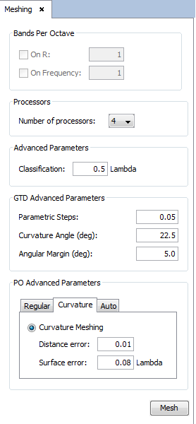 Select 1 processor and define the curvature mesh option with a distance error of 0.01 and surface error of 0.08 and left-click on Mesh.