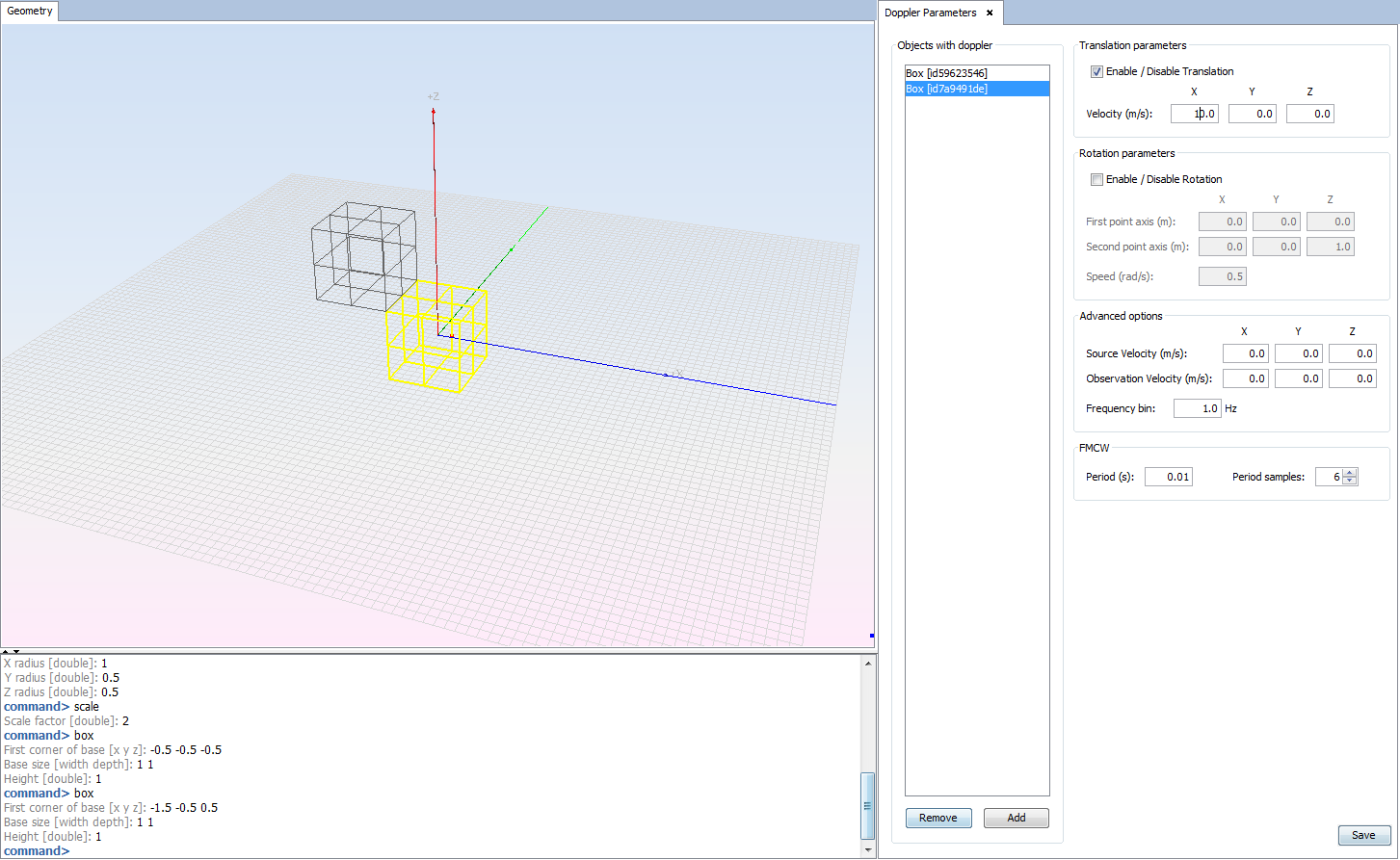 Now Doppler option in the Simulation menu is available. Click on Simulation -> Doppler. We are going to add doppler effects to the objects in the geometry. Select one box and press the Add button. The selected object is added to the list. Introduce the linear velocity of this object: