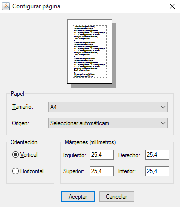 - Orientation ('Orientación' on the figure). Orientation of the print pages, vertical or horizontal.