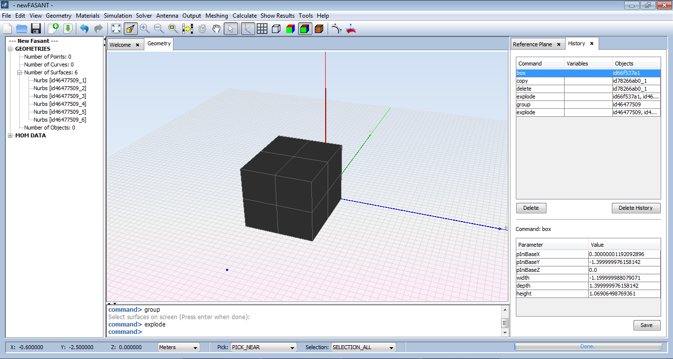 For example, In the figure below, we have an object and zero surfaces. If we select the explode option and the whole object, we can see that we now have six surfaces and zero objects.