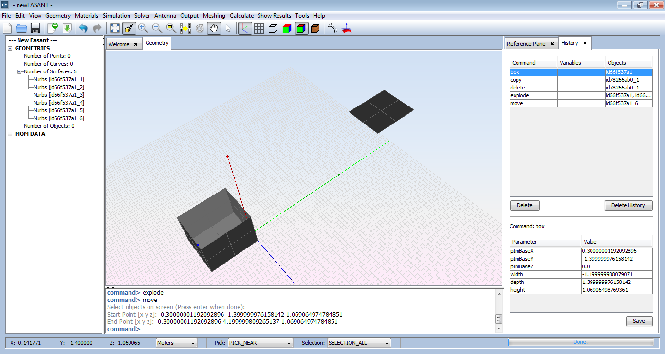 For example, if we want to move the object in the previous figure of the Copy section, we click on the object and select move. For the sake of illustration, we explode the box and then select only one of the exploded surfaces, after that, we introduce the origin and destination points. The result is shown in the following Figure.
