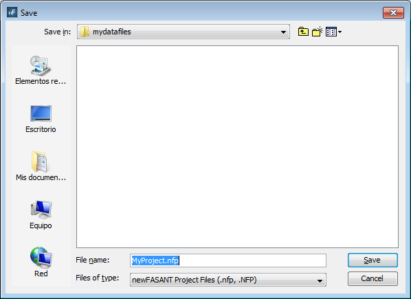 This option allows the user to save the current project in any location. When this option is selected, a save dialog will be shown requesting the location of the new newFASANT Project file (.nfp).