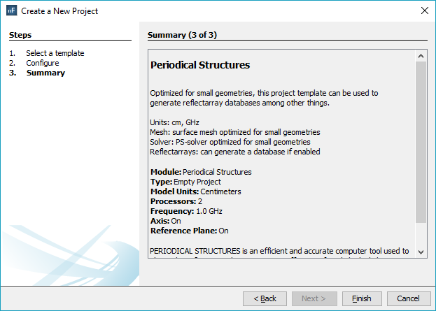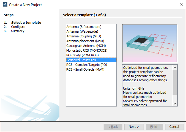 Using the project wizard it is possible to create new projects using a template for a particular case. If the simulation conditions are known, they save time by setting the default values for a project, such as units, simulation frequency and number of processors to use during the meshing and simulation stages.