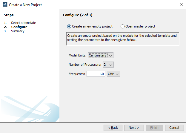 - Create a new empty project use this option to create a brand new project using the optimized default parameters for the particular template selected in the previous step. It is still possible to modify some of the parameters using the controls below, such as the default units, the number of processors (a number that is set by default to the number of processors in your system), or the project simulation frequency.