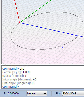 This command allows the user to create a circumference arc specifying its central point, radius, initial and final angles (in degrees), in this order.