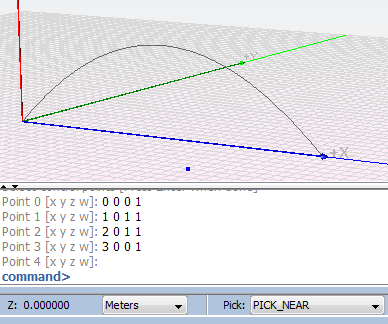 This option allows the user to generate a NURBS curve specifying its control points. After selecting this option, the console will require the degree of the curve (e.g. 1 for a linear NURBS curve, 2 for a quadratic NURBS curve and so on). After that, the user needs to specify as many control points (specifying their Cartesian coordinates as well as the weight associated with each point) as wished. When enough points are inserted, the user can press Enter to finish.