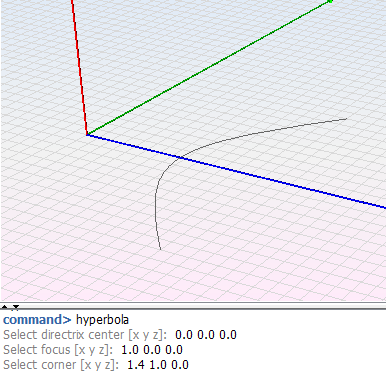 This option allows the user to create a hyperbola. The function receives the following parameters three points that represent the directrix center, focus and corner points.
