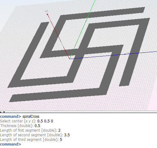 This option allows the user to create a spiral cross surface. The parameters needed for the creation will be asked to the user, namely, the center point of the cross, the thickness of the segments and the lengths of each segment.
