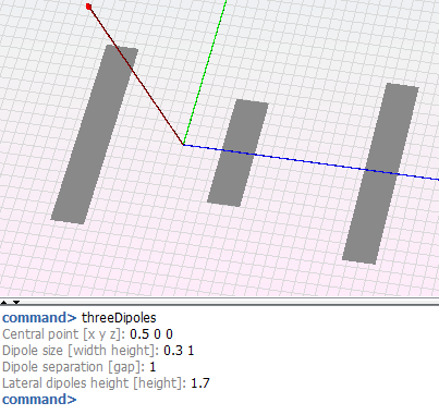 This option allows the user to create three dipoles in the geometry. The following parameters will be asked center point of the set of three dipoles, dipole size of the central dipole (width and height), separation between dipoles and height of the lateral dipoles.