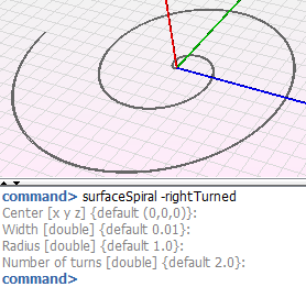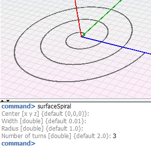 The primitive surfaceSpiral generates a coplanar set of surfaces that turns from the center to the end point, specified by the width, the radius and the number of turns. Some configurations of these parameters may generate invalid spirals, so the command will return an error with some suggestions for the parameters review.