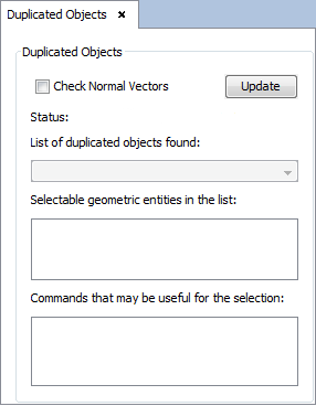 - Update Button Press it to repeat the identification of the duplicated elements in the current geometry. It is necessary when the Check Normal Vector option or some elements of the geometry have been modified.