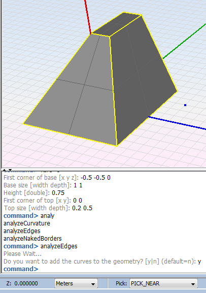 This tool shows the borders of the surfaces in the geometry that are considered as Edges, it means that they are not connected with another ones or even being connected, the transition between the normal vectors of the connected surfaces is discontinuous (define an angle greater than zero). The command only shows the edges, but it asks to the answer whether the detected edges must be added as new curves in the geometry or not, as shown in figure below (in this case, the 12 resulting curves has been added and selected to be highlighted).